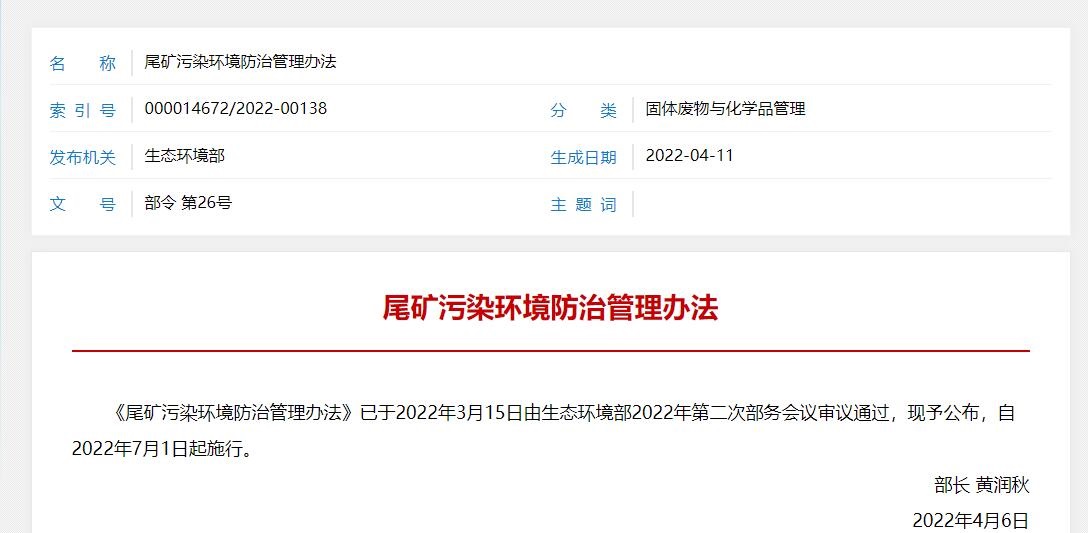 《尾礦污染環境防治管理辦法》將于今年7月1日生效,其中明確要求尾礦庫運營、管理單位建立健全尾礦庫污染隱患排查治理制度。《指南》發布,將指導生態環境部門組織開展尾礦庫污染隱患排查治理和監督管理,以及指導尾礦庫運營、管理單位自行開展尾礦庫污染隱患排查治理。